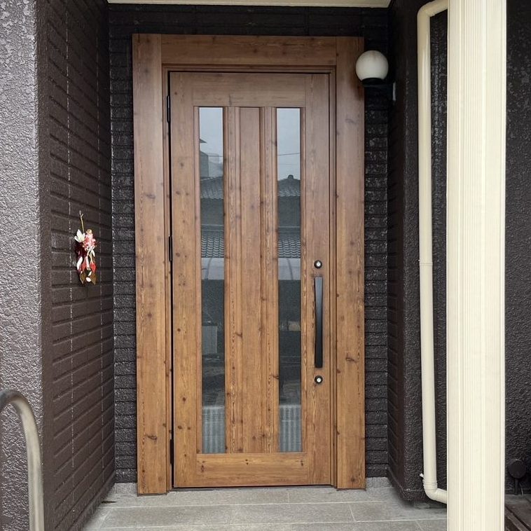 新しい玄関ドアになって、見た目がすごく素敵になりました!木目調のデザインがとてもお洒落で、家の印象がぐっと良くなった気がします。ドアがしっかりしているので防犯面でも安心感があり、最新の鍵が付いているのも嬉しいポイントです。