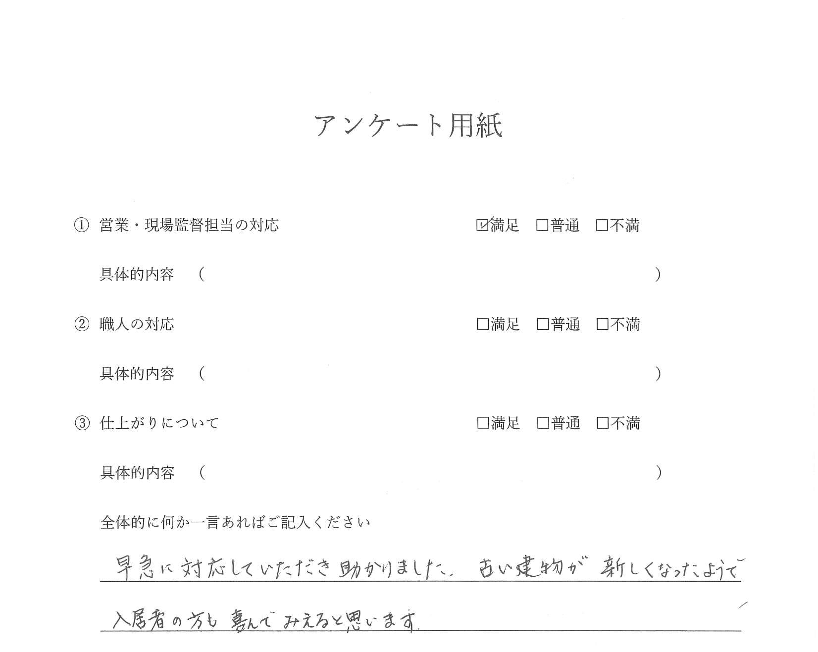 早急に対応していただき助かりました。古い建物が新しくなったようで、入居者の方も喜んで見えると思います。