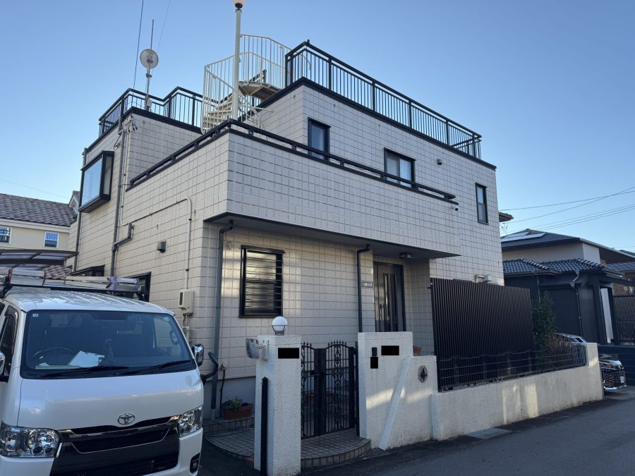 施工前の外観は、年数が経つにつれて家全体がやや暗い印象を与えるようになっていました。今回の塗装では、長く住み慣れた家をもう一度明るく若々しい印象にしたいというお客様のご希望もあり、外壁色には思い切ってホワイトを選択し清潔感と開放感を兼ね備えた色味で、新たな外観イメージを実現することとなりました。