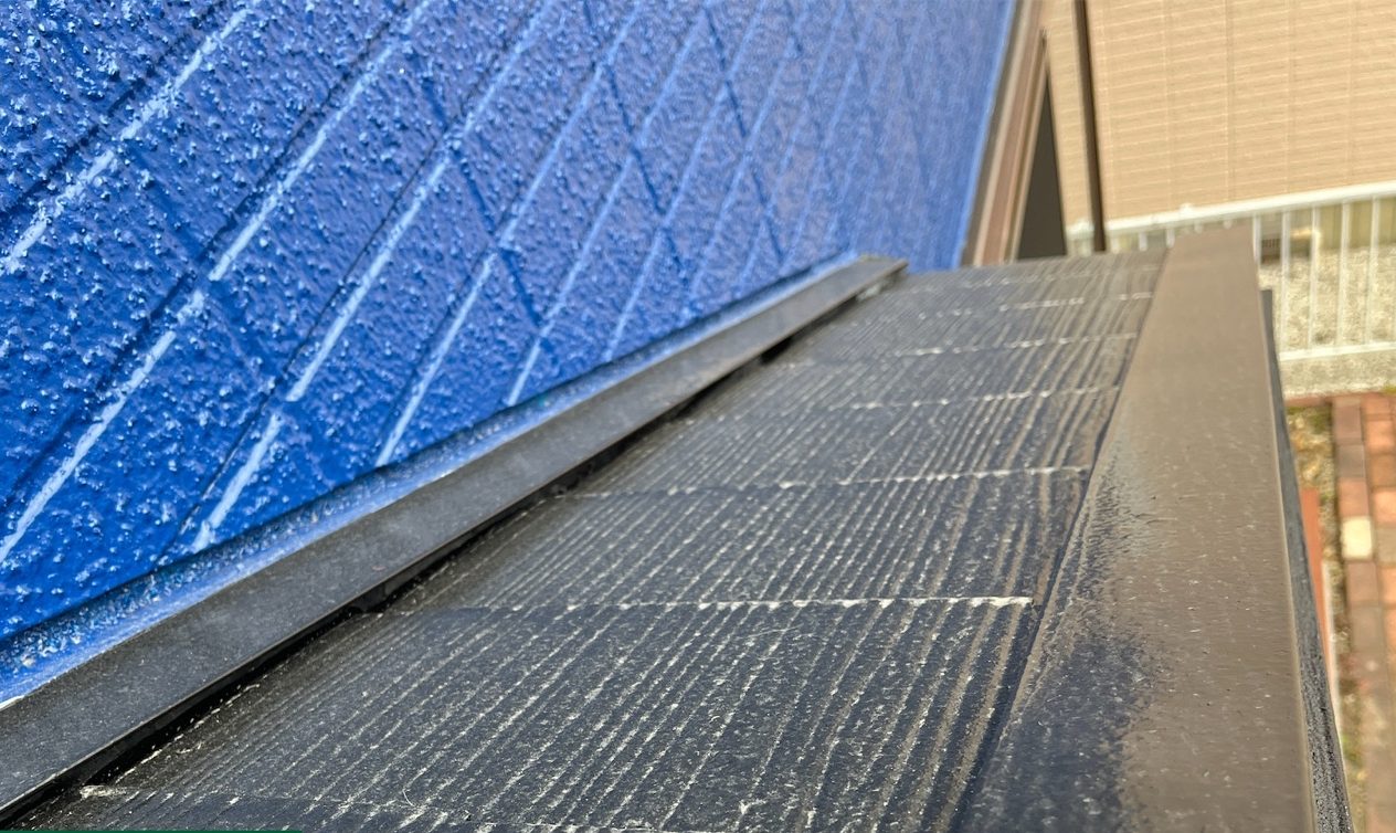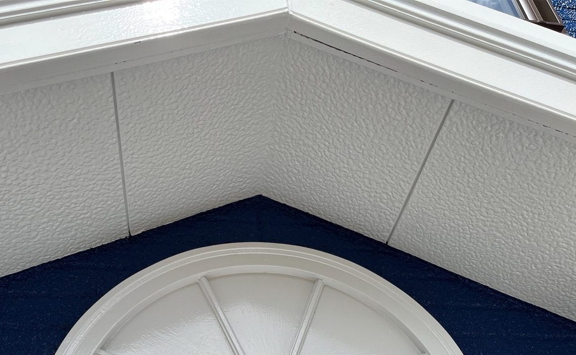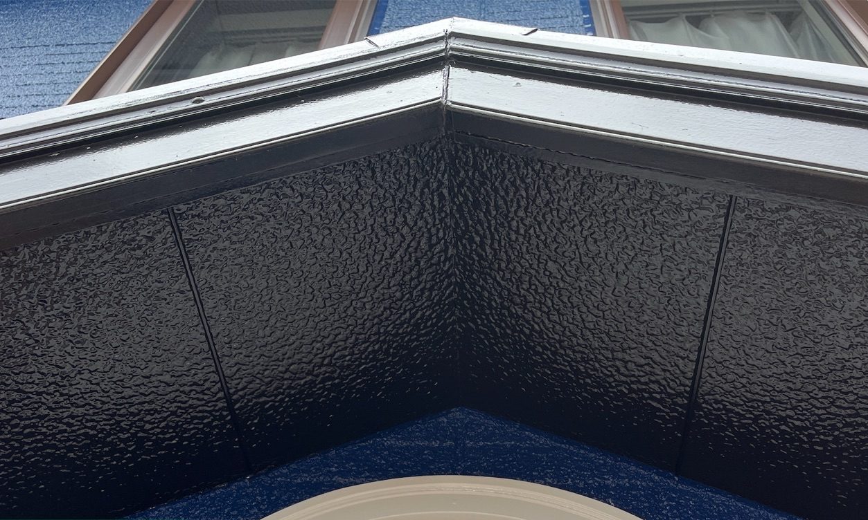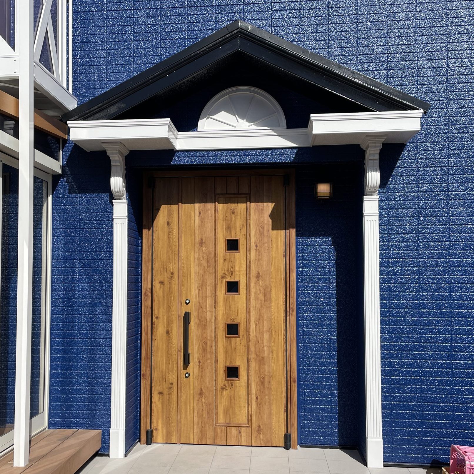 今回、リメイクホームさんにお願いすることになったのは、たまたま目にした新聞の折り込みチラシがきっかけでした。他社で外壁と屋根の塗装を済ませていたのですが、玄関ポーチ周辺の色がどうしてもイメージと違っていて、特に屋根と破風板、軒天の黒い色味が外壁のブルーと合わず、ずっと気になっていました。