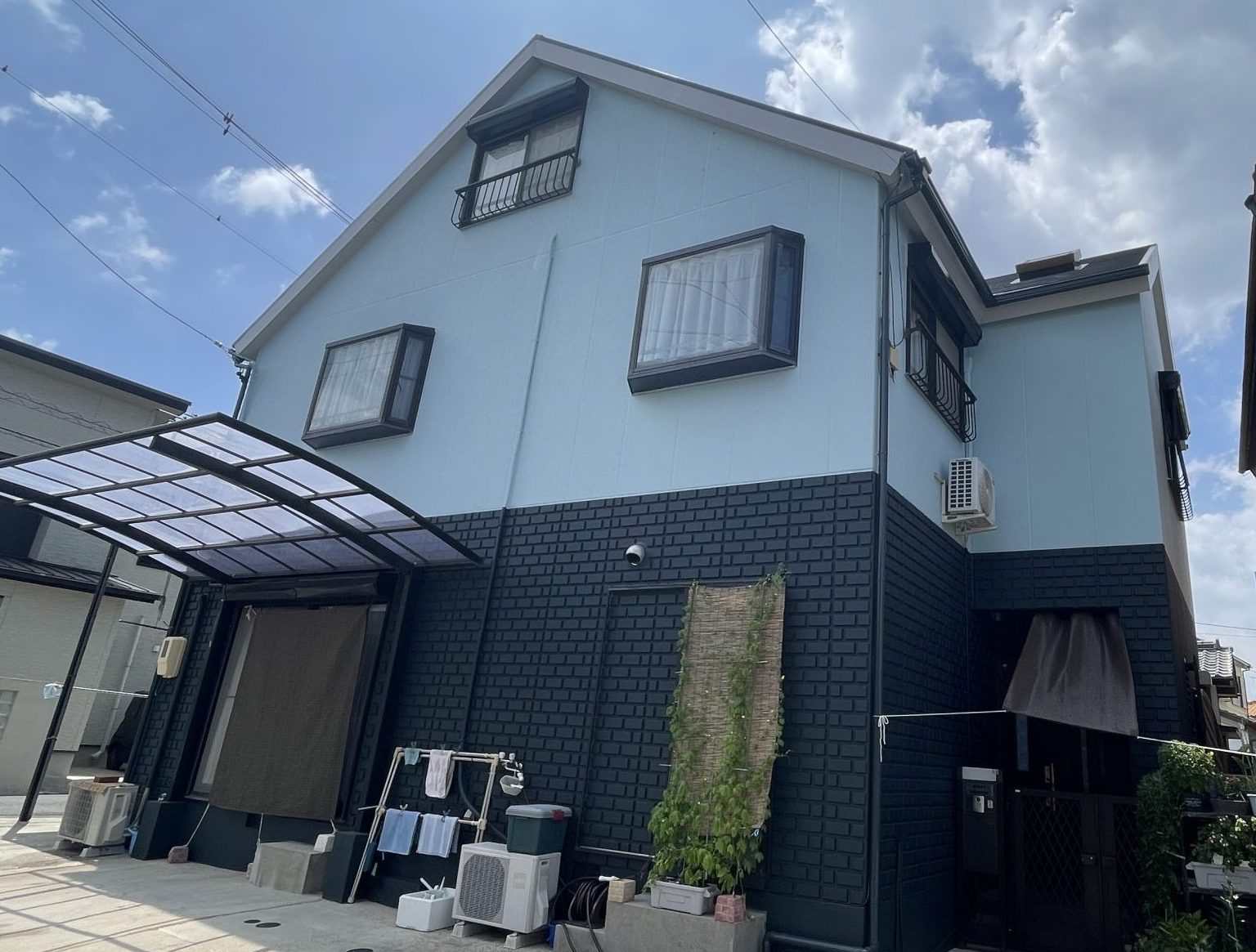 仕上がりは本当に見違えるほど綺麗で、古い建物とは思えないほどピカピカになりました。元々は水色一色だった外壁が、1階部分を濃い色、2階部分を明るい水色に塗り分けるツートンカラーになったことで、ぐっとおしゃれな印象になりました。正直、色は思っていたイメージと少し違っていましたが、実際に完成した家を見て「これはこれでとても良い」と思えたので、結果的には大満足です。