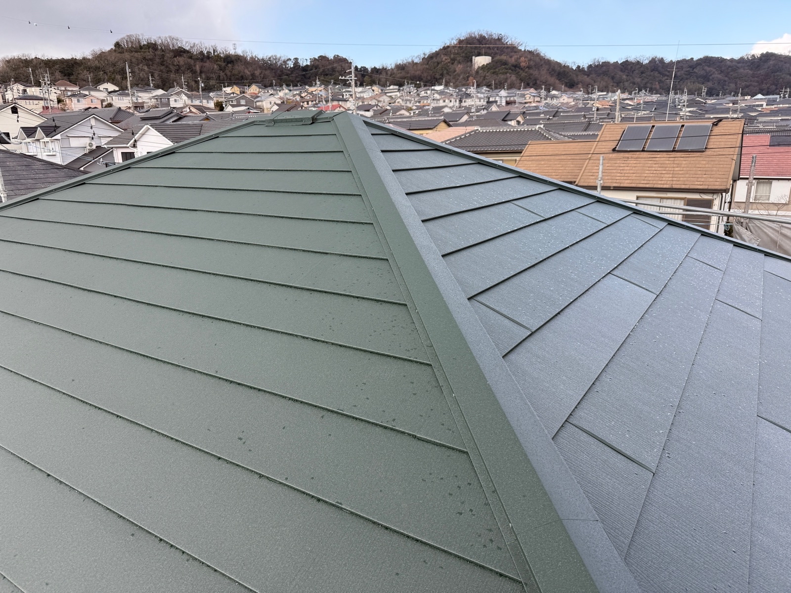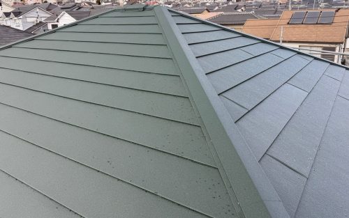 施工前は、煙突からの雨漏れにより室内への影響が懸念され雨が降るたびに不安を抱える状況でした。屋根の老朽化も進み早急な修繕が必要な状態でしたが、今回の屋根カバー工法により、雨漏れの心配は一切なくなりました。施工後は、耐久性の高い屋根材でしっかりと保護され、外観も美しく一新されました。見た目の美しさだけでなく、安心して暮らせる住環境へと生まれ変わりました。