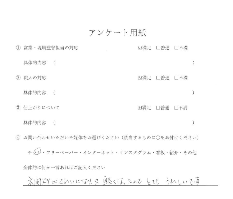 このたびは、数ある業者の中から弊社に玄関ドア交換工事をご依頼下さいまして誠にありがとうございました。工事期間中は、ご協力を賜りスムーズに作業を進めることができましたこと心より御礼申し上げます。