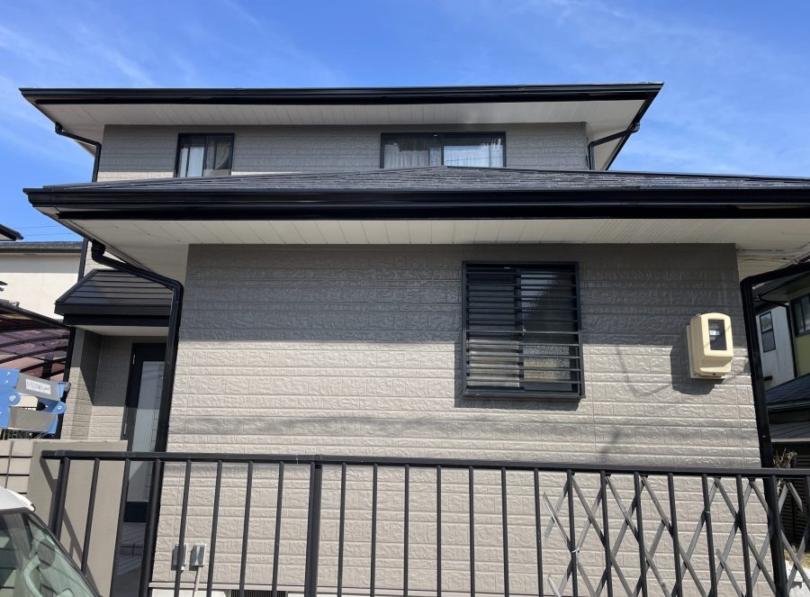 施工前は色あせや汚れが目立ち、やや暗い印象の外観でしたが、外壁には「RH-4 シャイングレー」、屋根には「RH-15 ブラック」を採用。落ち着きのある上品な色合いで、建物全体が新築のように生まれ変わりました。