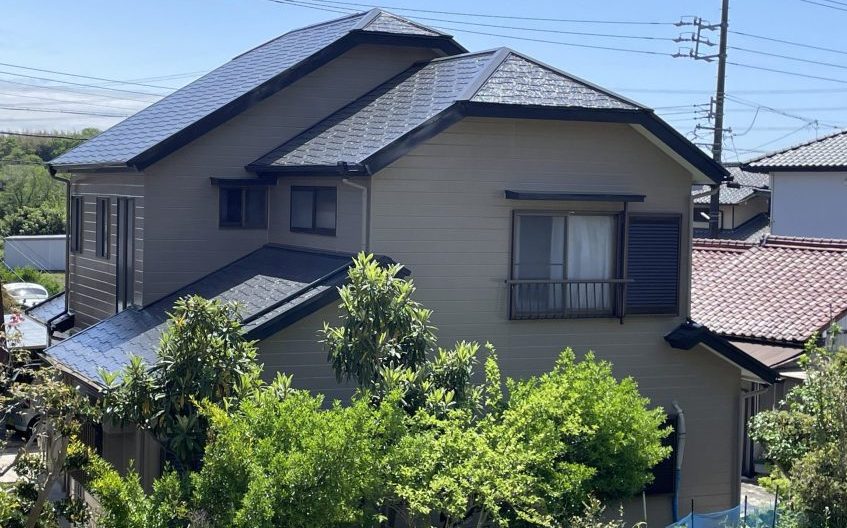 完成した後の屋根と外壁を見たときは、本当に感動しました。赤く変色してしまっていた屋根は、落ち着いたダークグレーに生まれ変わり、まるで新築のような美しさになりました。外壁も、選んだベージュ系の色合いがとても上品で、クリヤートップコートの艶も加わり、見違えるような外観に仕上がりました。細部まできちんと仕上げられていて、見れば見るほど満足感が増していきます。