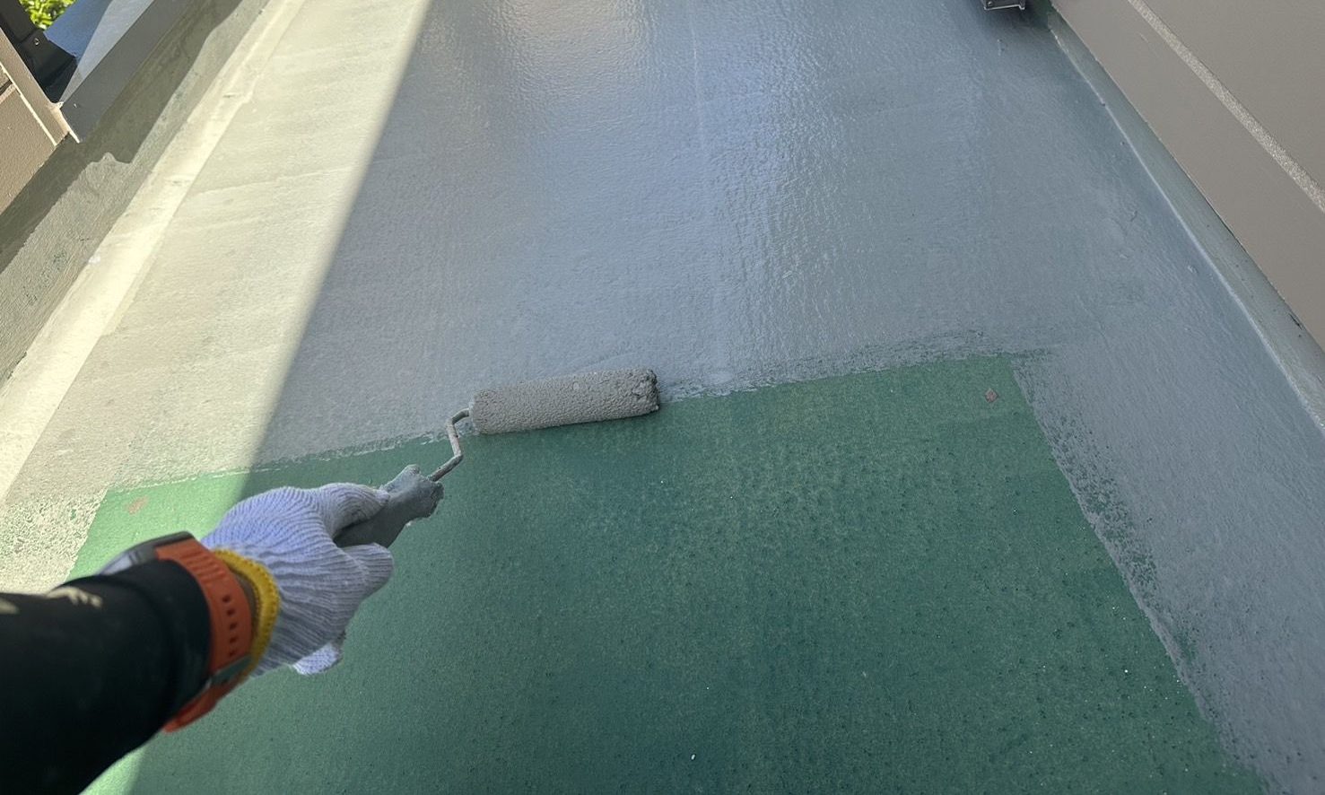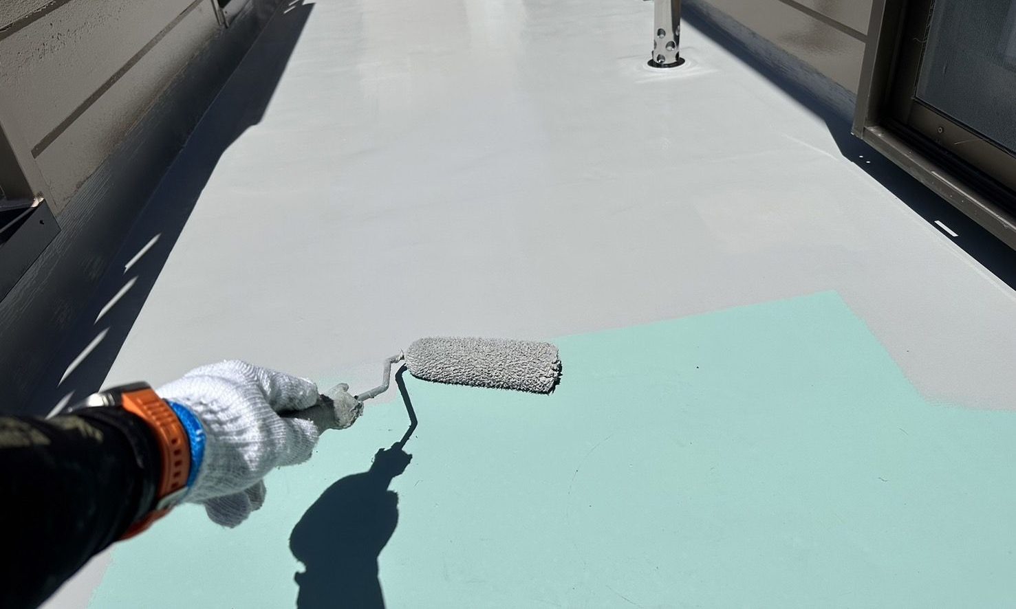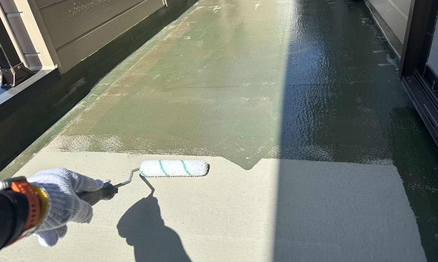 ベランダ部分にはウレタン防水通気緩衝工法を採用し、下地から防水層までしっかり施工することで、今後も安心してお住まいいただける状態に仕上げました。