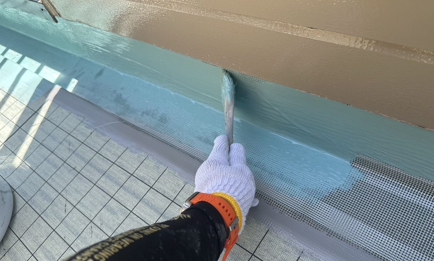 立ち上がり部メッシュ貼り・ウレタン塗布 施工中