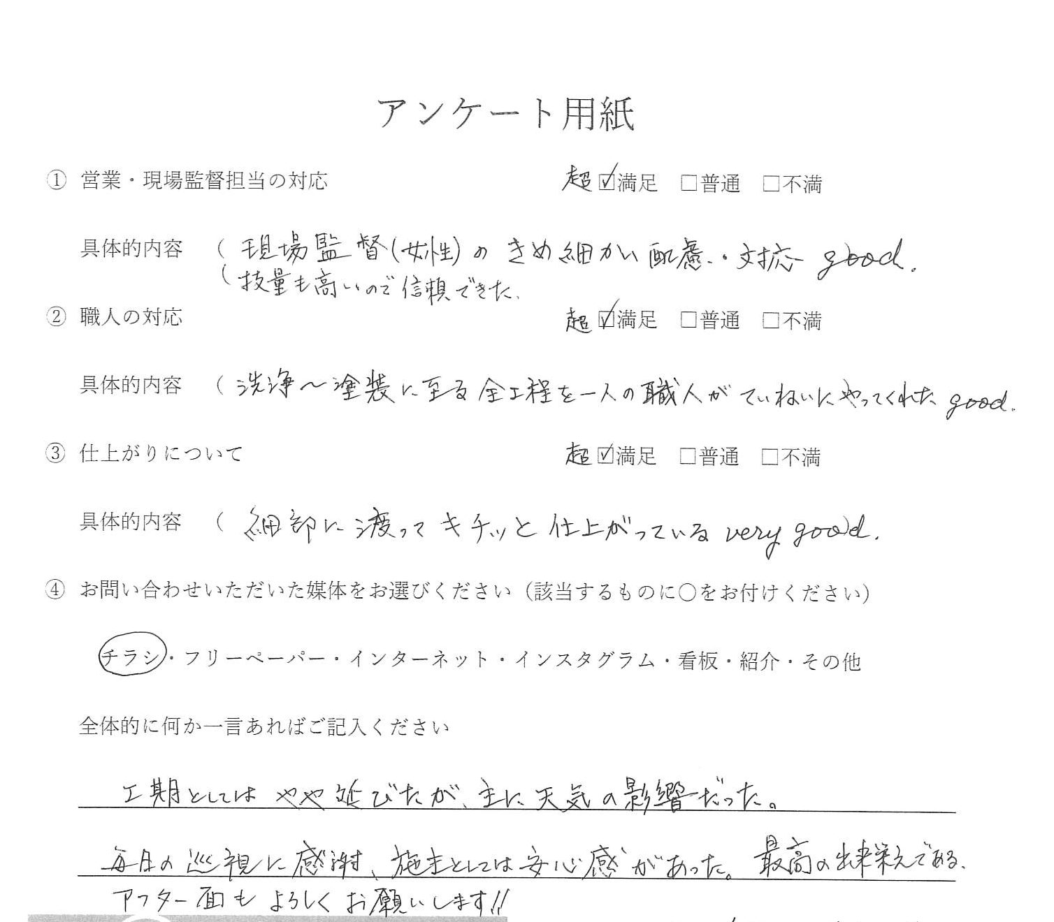 この度は本当に素晴らしい工事をしていただき、心より感謝しております。営業の方、そして現場監督さんの対応は、初回のお打ち合わせの時からとても丁寧で、こちらの細かい質問や要望にもきめ細かく応えていただけました。特に印象的だったのは、提案力の高さです。他社さんにも見積もりをお願いしていたのですが、屋根のクリヤートップコートやベランダの防水工事など、より長持ちさせるための具体的な提案をしていただけたのが決め手となりました。