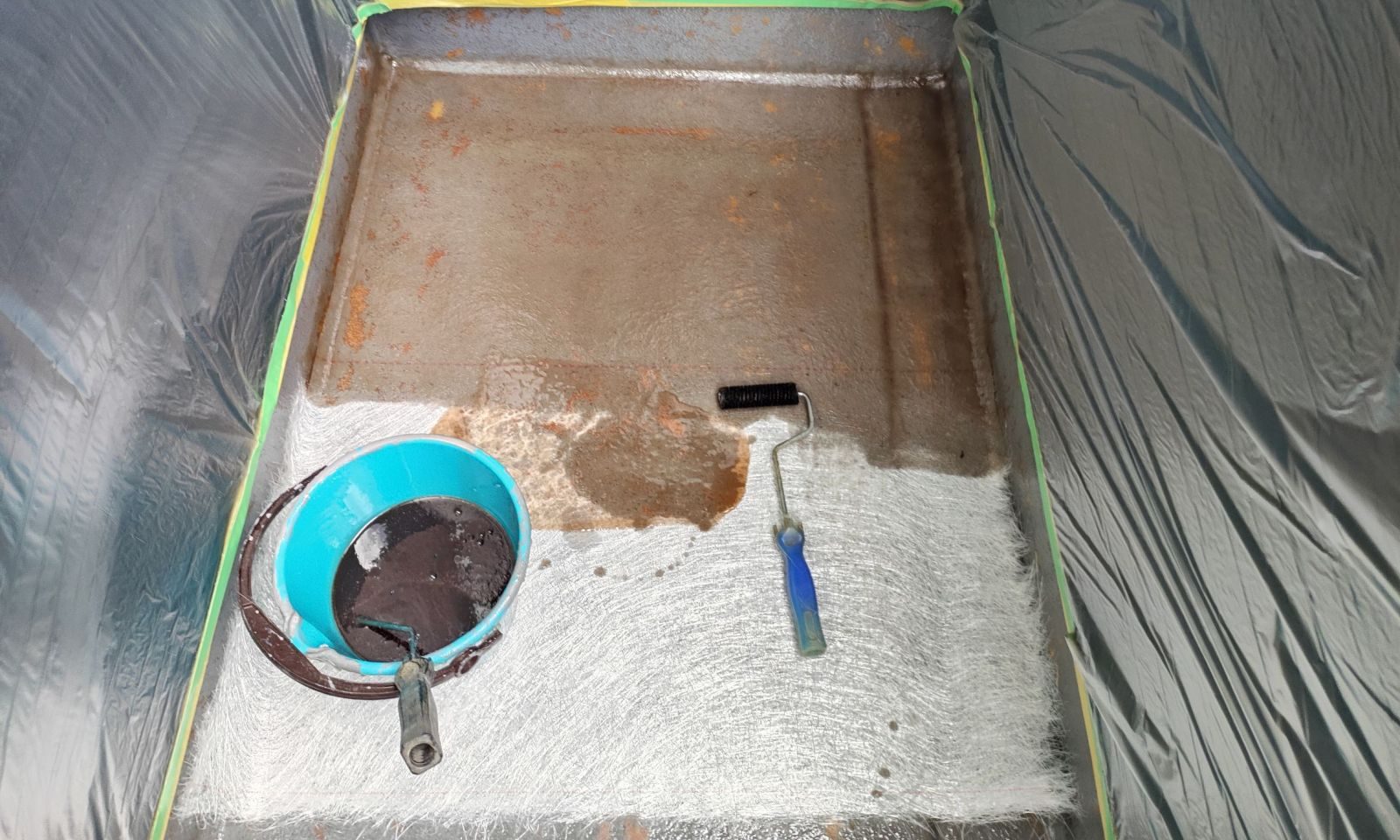 ライニング (ガラスマット+ポリエステル樹脂塗布) 施工中