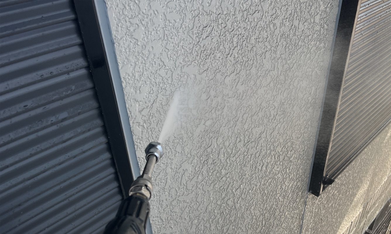 まずは高圧洗浄を行い、外壁・屋根ともに汚れや旧塗膜をしっかり除去。
