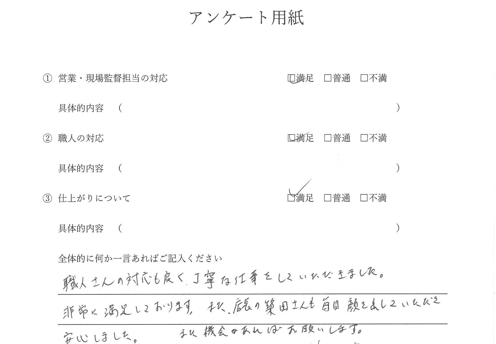 職人さんの対応もよく、丁寧な仕事をしていただきました。非常に満足しております。また、店長の築田さんも毎日顔を出していただき安心しました。また機会があればお願いします。