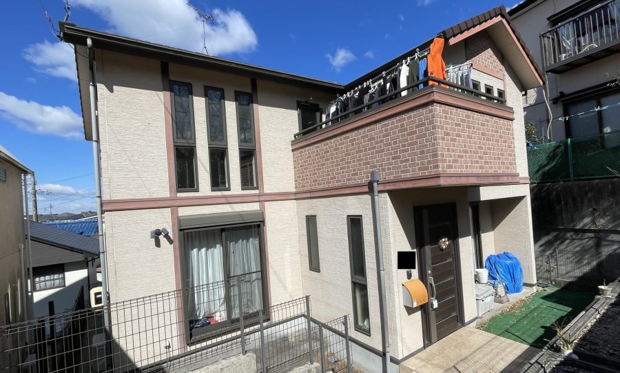 施工前は、外壁全体がアイボリーを基調としタイル調のデザインが施された柔らかい印象の外観でした。しかし経年劣化により色褪せや汚れが目立ち、全体的に落ち着いた雰囲気になっていました。施工後は、外壁をナスコンとマホガニーで仕上げることで、深みのある色合いと高級感が際立つスタイリッシュな外観へと生まれ変わりました。以前の優しい印象から一転引き締まった印象のカッコイイ仕上がりとなり、お客様にも大変ご満足いただけました。