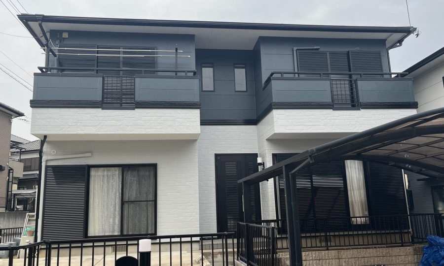 今回使用した塗料は、外壁には耐久性に優れた「ナノウォール15」、屋根には遮熱効果のある「快適サーモSI」。色は、外壁がライトグレーとブルーグレーのツートン、屋根はサーモナチュラルグレーという組み合わせで、上品かつ落ち着いた印象に仕上がりました。