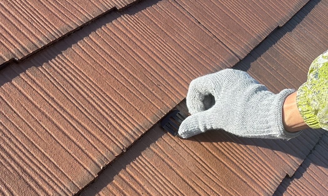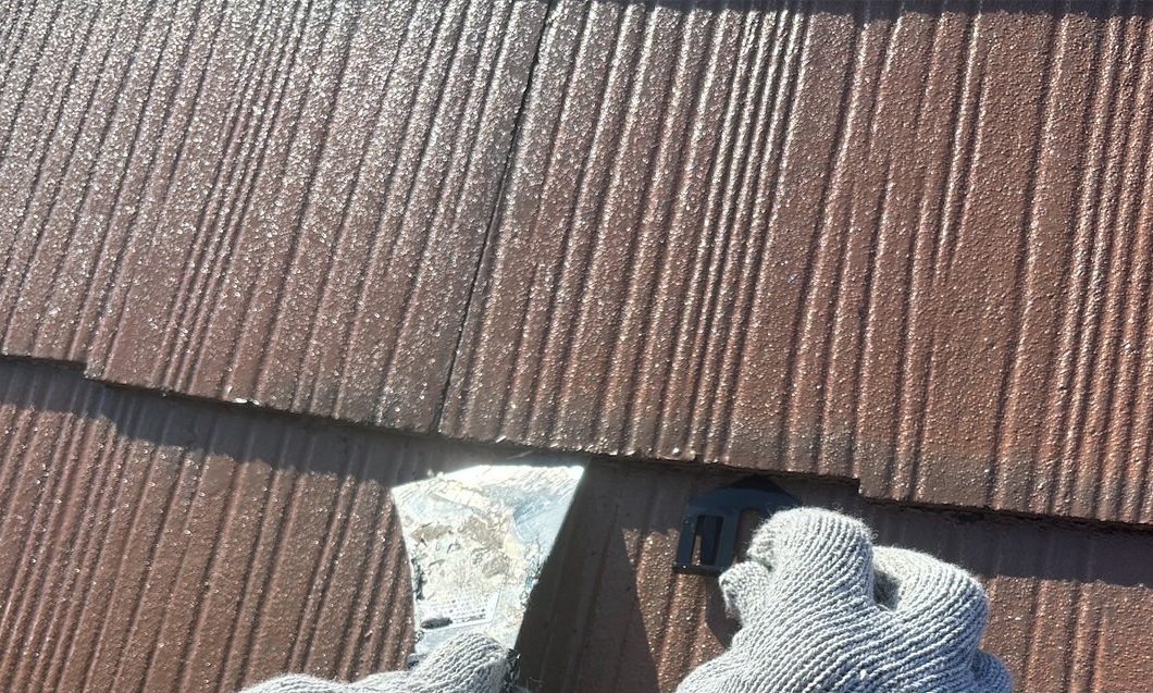 屋根のカラーベストは全体的に色褪せが進み、コケの発生や雨水の吸い込みも確認される状態でした。