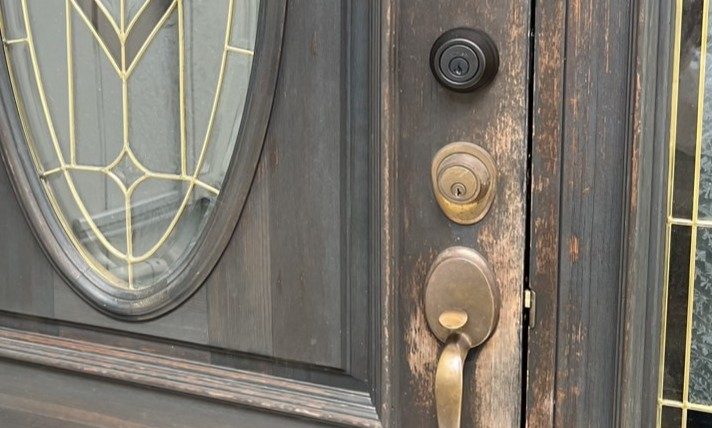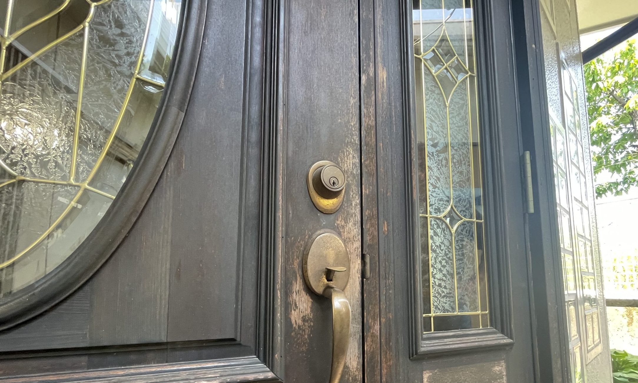 我が家は輸入住宅で、ステンドグラスの入った木製の玄関扉が特徴です。その分、経年による劣化も目立ちやすく、ここ数年は色褪せや表面のざらつきが気になっていました。特にドアノブや鍵のまわりは手がよく触れることもあり、塗装が完全に剥がれて木の地肌が見えてしまっていたため、どうにかしたいと考えていました。
