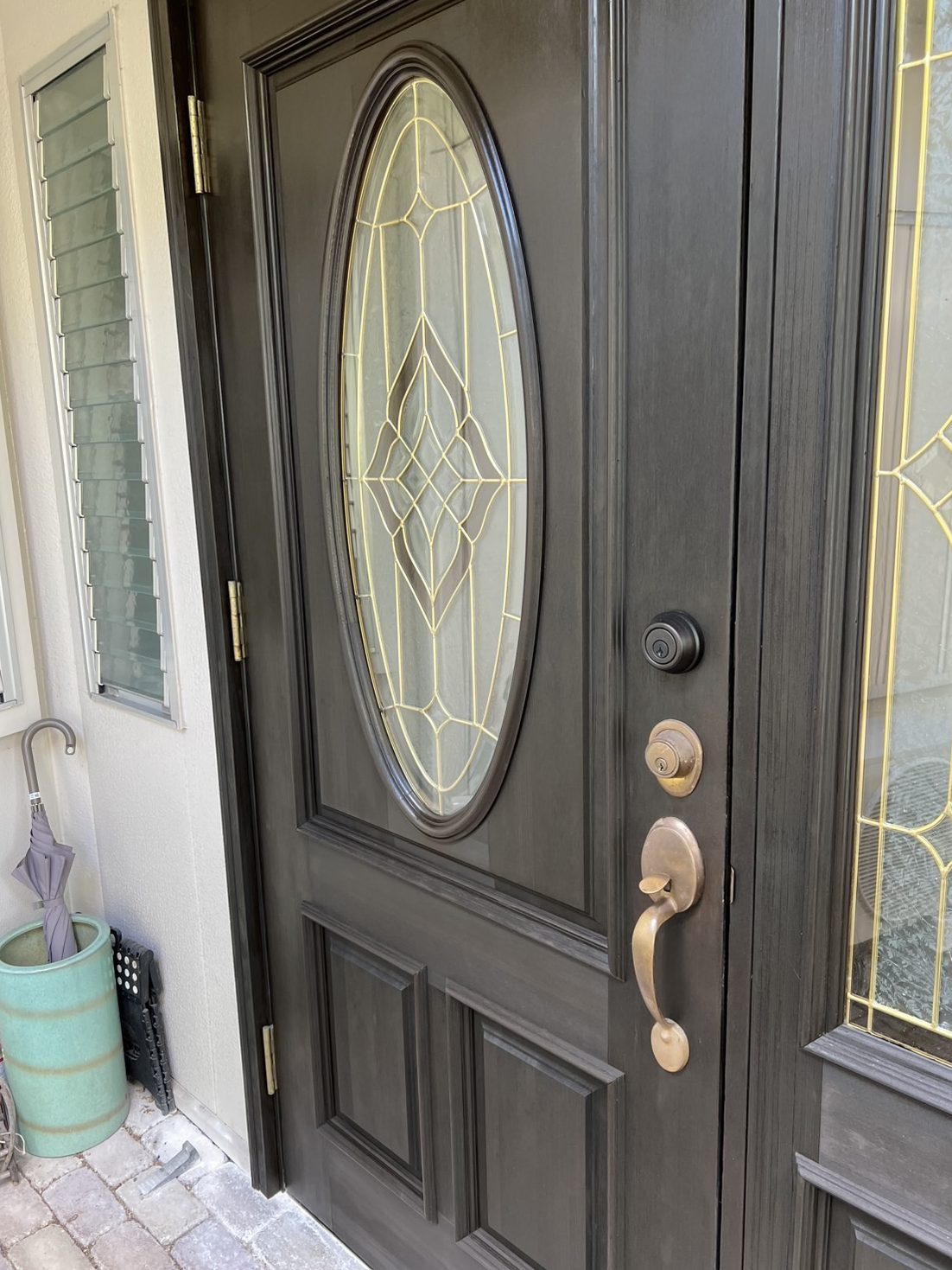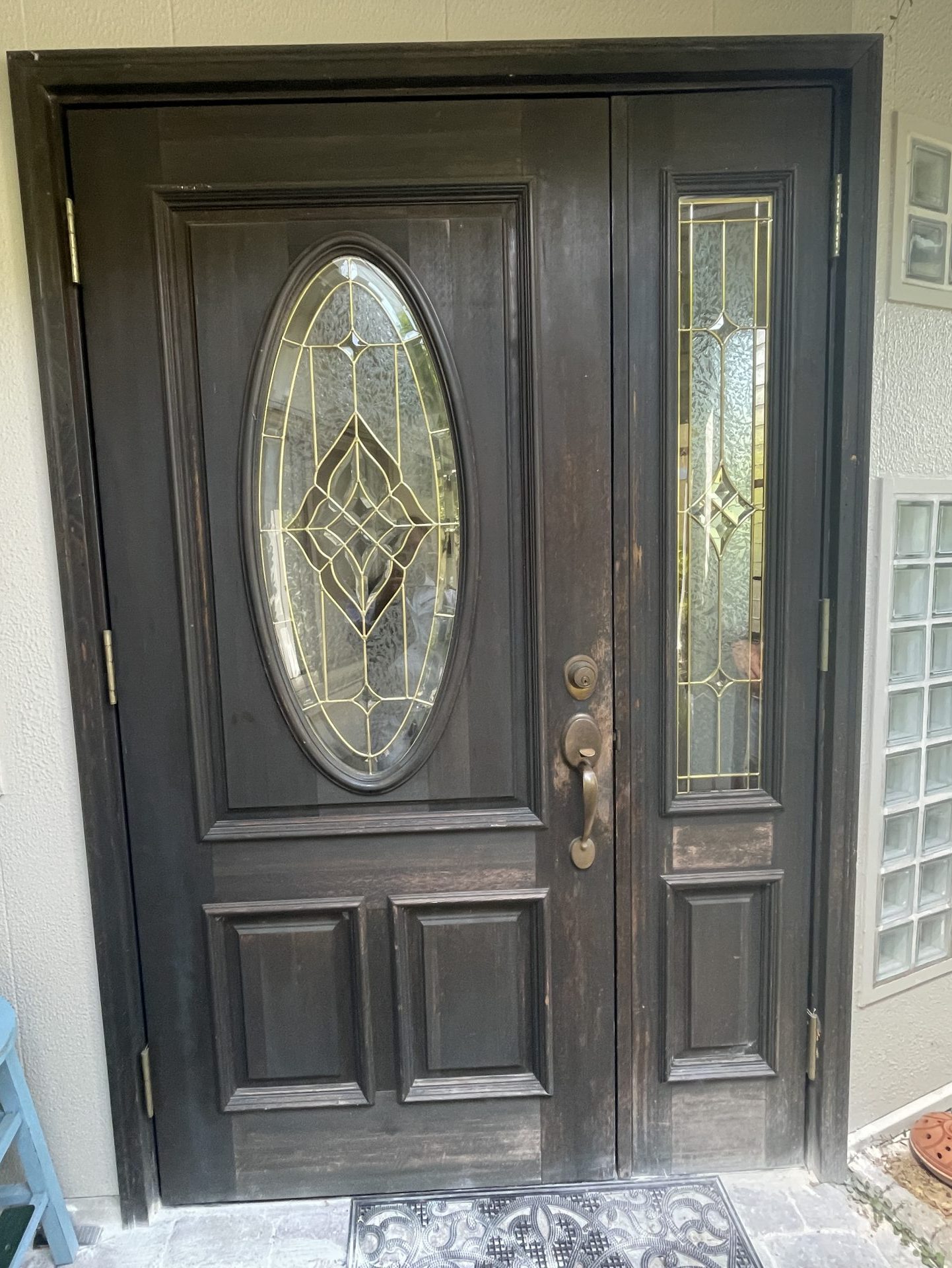 我が家は輸入住宅で、ステンドグラスの入った木製の玄関扉が特徴です。その分、経年による劣化も目立ちやすく、ここ数年は色褪せや表面のざらつきが気になっていました。特にドアノブや鍵のまわりは手がよく触れることもあり、塗装が完全に剥がれて木の地肌が見えてしまっていたため、どうにかしたいと考えていました。
