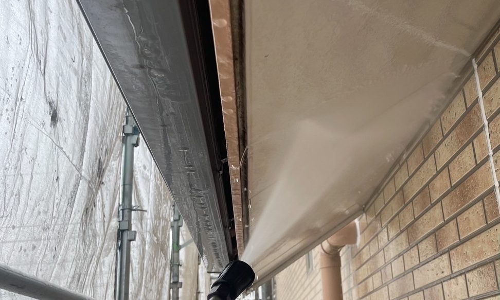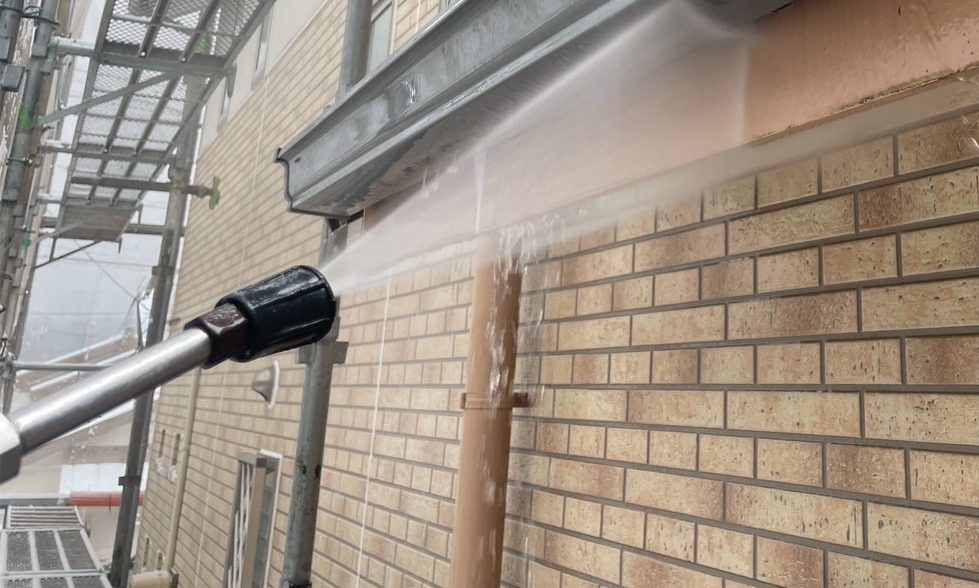 続いて高圧洗浄で外壁の汚れや古い塗膜をしっかりし、下塗り・中塗り・上塗りの3工程で丁寧に塗装を実施。
