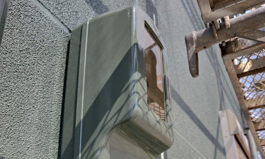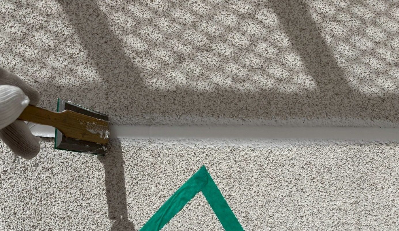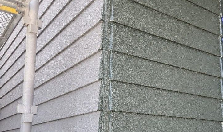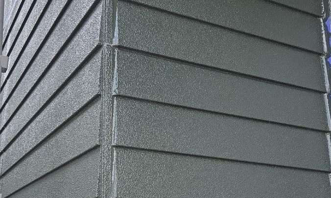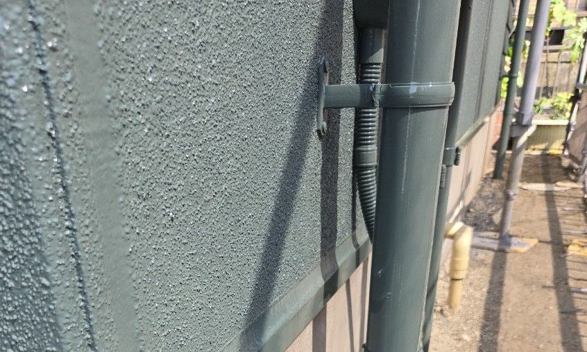 外壁塗装は耐久性の高いピュアフレックス無機を使用し、ツートンカラー(モスグレー+ディープグリーン)で4回塗り施工。濃淡を活かしながら、ムラのない仕上がりを目指しました。