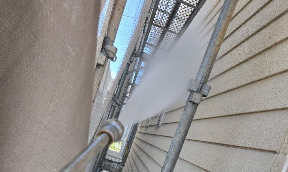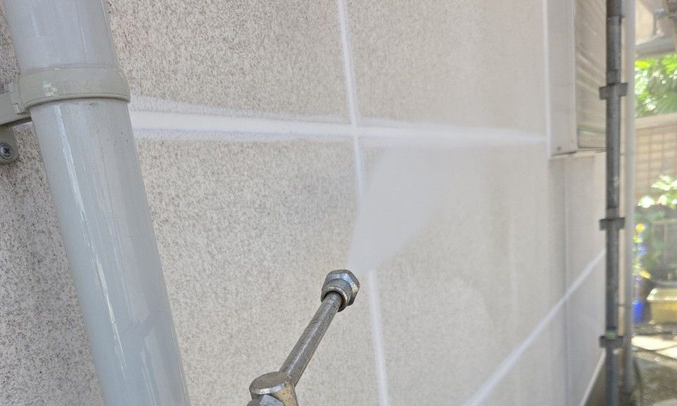 まずは外壁の高圧洗浄で長年の汚れやコケを丁寧に除去し、下地を整えました。
