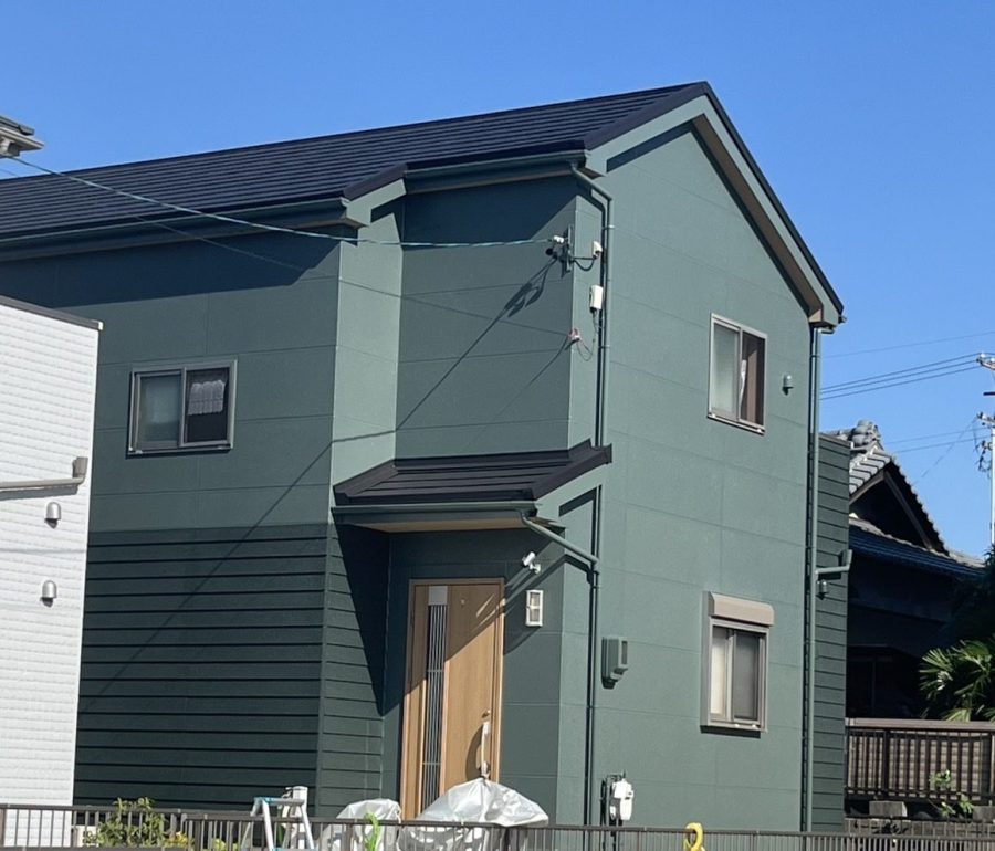 外壁塗装は耐久性の高いピュアフレックス無機を使用し、ツートンカラー(モスグレー+ディープグリーン)で4回塗り施工。濃淡を活かしながら、ムラのない仕上がりを目指しました。