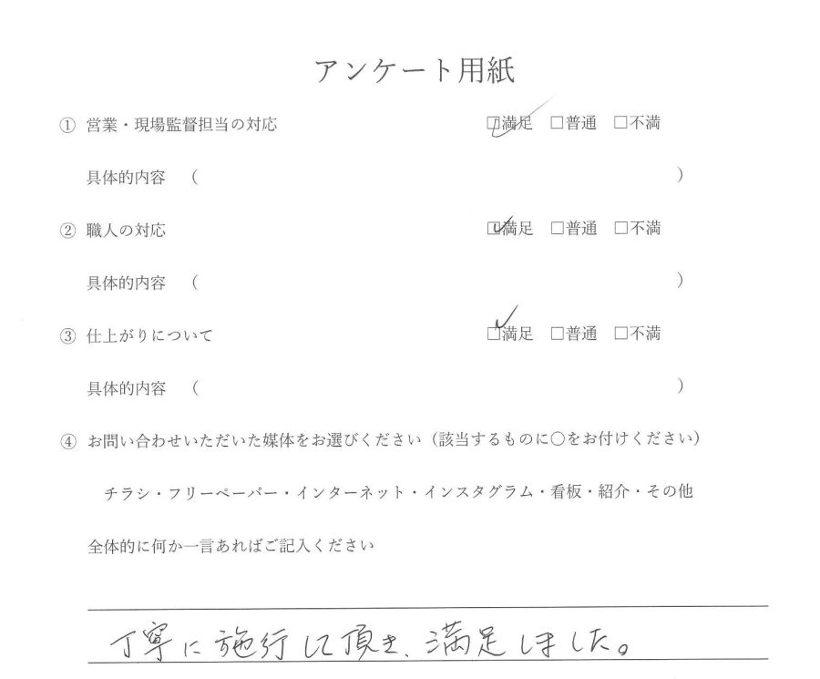 全体を通して「丁寧に施工して頂き、満足しました」という言葉がそのままの感想です。今回の工事で、リメイクホームさんの誠実さと技術力を実感しました。今後もメンテナンスやリフォームの際には、ぜひまたお願いしたいと思っています。