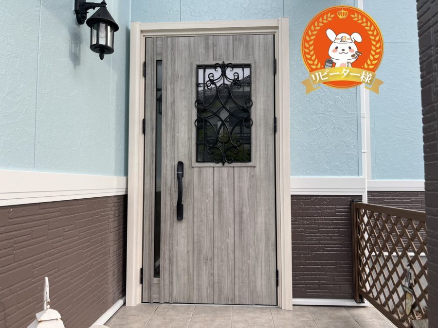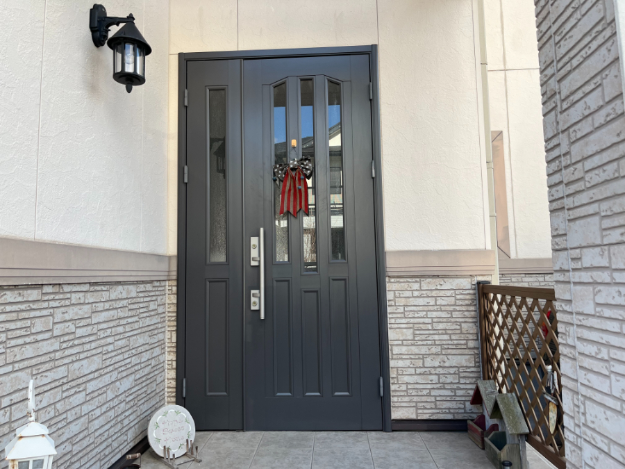 仕上がった玄関ドアを見て、本当に追加でお願いして良かったと思いました。外壁をきれいにした分、新しいドアになったことで家全体がまとまった印象になりました。デザインも気に入っています。