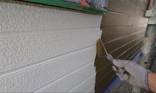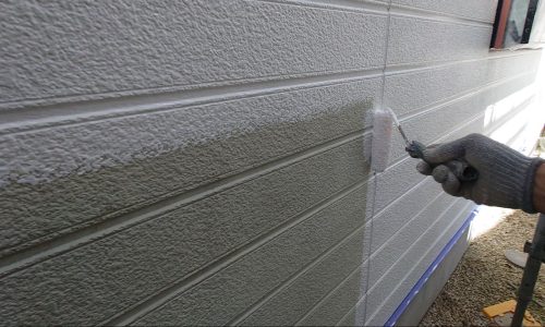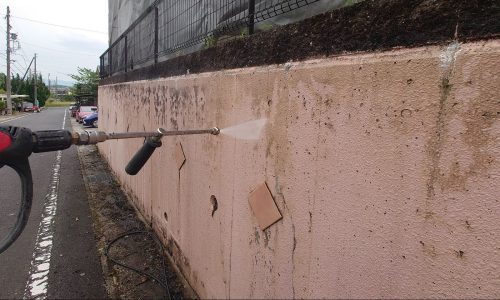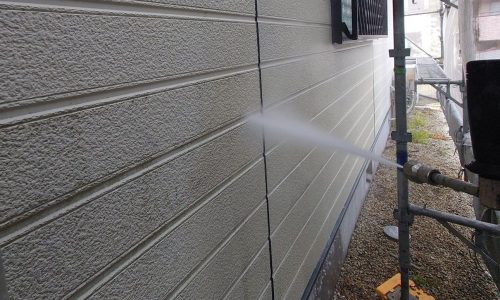 施工に入る前に、まずは外壁全体の高圧洗浄を実施し、旧塗膜や汚れ、カビ等をしっかり除去しました。間板目地は撤去したのち、打ち替え工法にて新たに充填。下地処理では外壁の細かなひび割れや段差を補修し、仕上がりの美しさと耐久性を高めました。