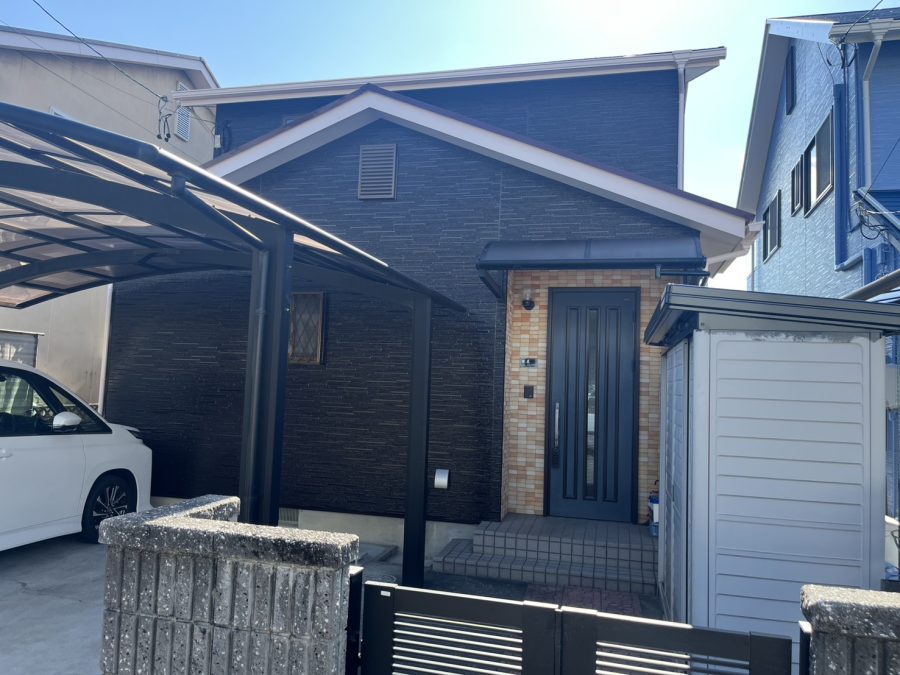 もともとは白系の外壁でしたが、今回は濃い色へ塗り替えを行い、お住まい全体の雰囲気が大きく変わりました。