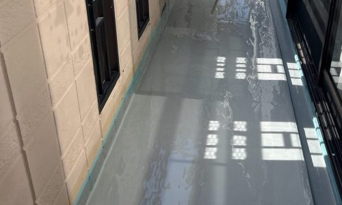 下地が整ったタイミングで、外壁にはナノコンポジットWを用いた塗装作業を実施し、均一な仕上がりになるよう細部まで丁寧に塗り重ねました。屋根には耐候性に優れたRHピュアフレックス無機を採用し、退色や劣化に強い塗膜を形成しています。ベランダについては下地補修を行った上でウレタン防水を施工し、雨水から建物を守る防水性能を回復させました。
