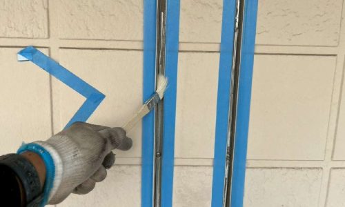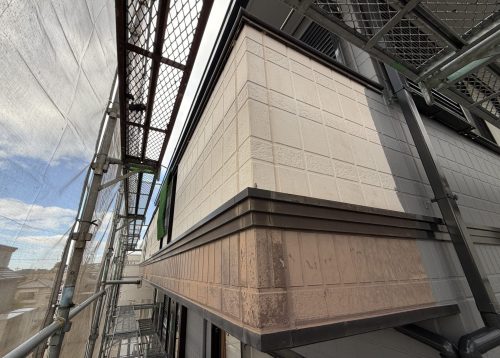 工事は、外壁・屋根・ベランダ防水の各工程がスムーズに連携するよう調整しながら進めました。まずは足場を設置し、高圧洗浄で外壁や屋根に付着した汚れ・苔・旧塗膜を丁寧に洗い落としました。その後、外壁の要となるシーリング工事に移り、劣化していた目地材をすべて撤去して新しいシーリング材へ打ち替えました。