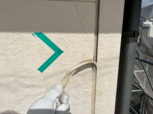 築15年が経過し、外壁にはチョーキング現象が発生していました。手で触れると白い粉が付着する状態で、防水性の低下が懸念されました。また、シーリング材にはひび割れや痩せが確認され、タイル部分も艶が失われて色褪せが目立つ状態でした。