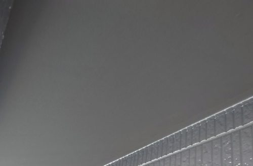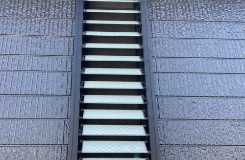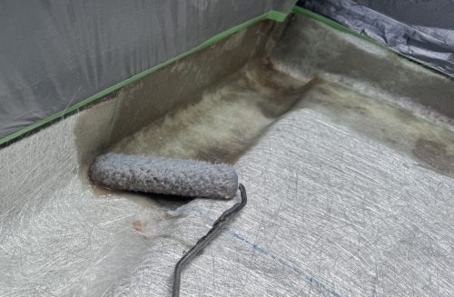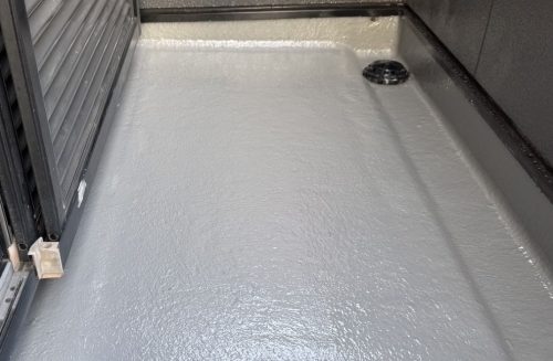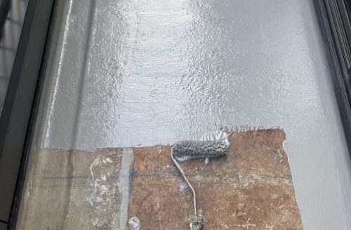外壁部分では、帯板が経年劣化によって浮いている箇所が見受けられたため、まずはタッピング処理を行い、しっかりと固定したうえで塗装工程へ進みました。屋根塗装・ベランダ防水については、既存のFRP防水層が浮いて剥離していたため、まずは劣化した層を撤去し、下地を平滑に整えました。その後、強度と耐久性に優れた2プライ工法にて新たな防水層を構築。トップコートまでしっかりと塗り上げることで、防水性能を回復させるだけでなく、将来的な雨漏りリスクを抑える丈夫なベランダへと仕上げています。付帯工事として浴室ガラスの交換を致しました。