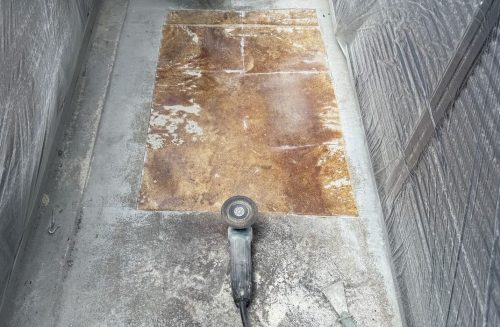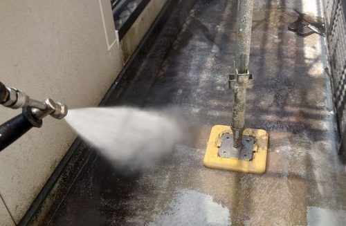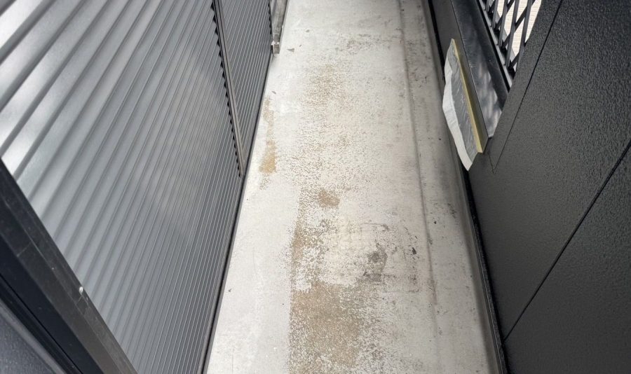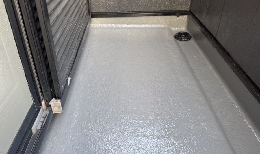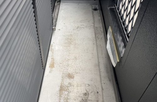 ベランダ防水では、まず既存のFRP防水層が広範囲で剥離していたため、劣化している部分を丁寧に撤去する作業から着手しました。下地が露出する工程が多くなるため、雨水の影響を受けやすく、天候管理が非常に重要な作業となります。そのため、職人と共有しながら雨雲レーダーの動きを常に確認し、少しでも降雨の可能性がある場合には作業手順を見直すなど、慎重に進めるよう指示を徹底しました。安全で確実な施工を行うために、天候と作業のタイミングを見極めながら丁寧に仕上げた防水工事となりました。