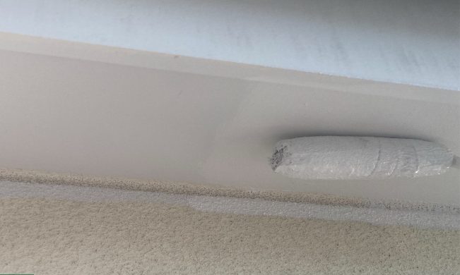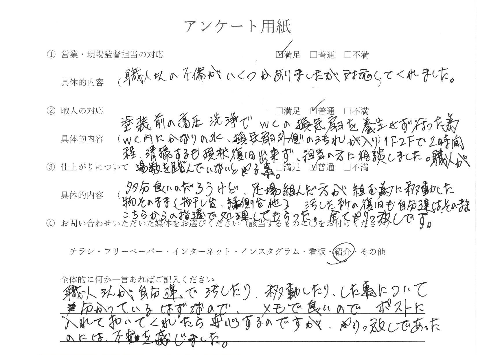 工事の初期段階で、高圧洗浄の際に誤ってトイレ内に水が入ってしまうというミスが発生しましたが、その後、保険対応にてクロスを張り替えてもらいました。