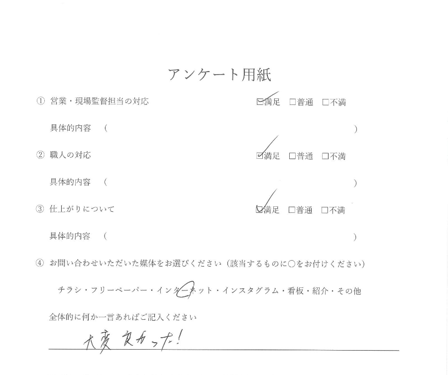 この度は、我が家の屋根工事およびトイレクロス内装工事にご対応いただき誠にありがとうございました。最初にお問い合わせをした段階から最後のお引き渡しまで、終始変わらない誠意ある姿勢で向き合ってくださり、安心して工事をお任せすることができました。改めて心より感謝申し上げます。