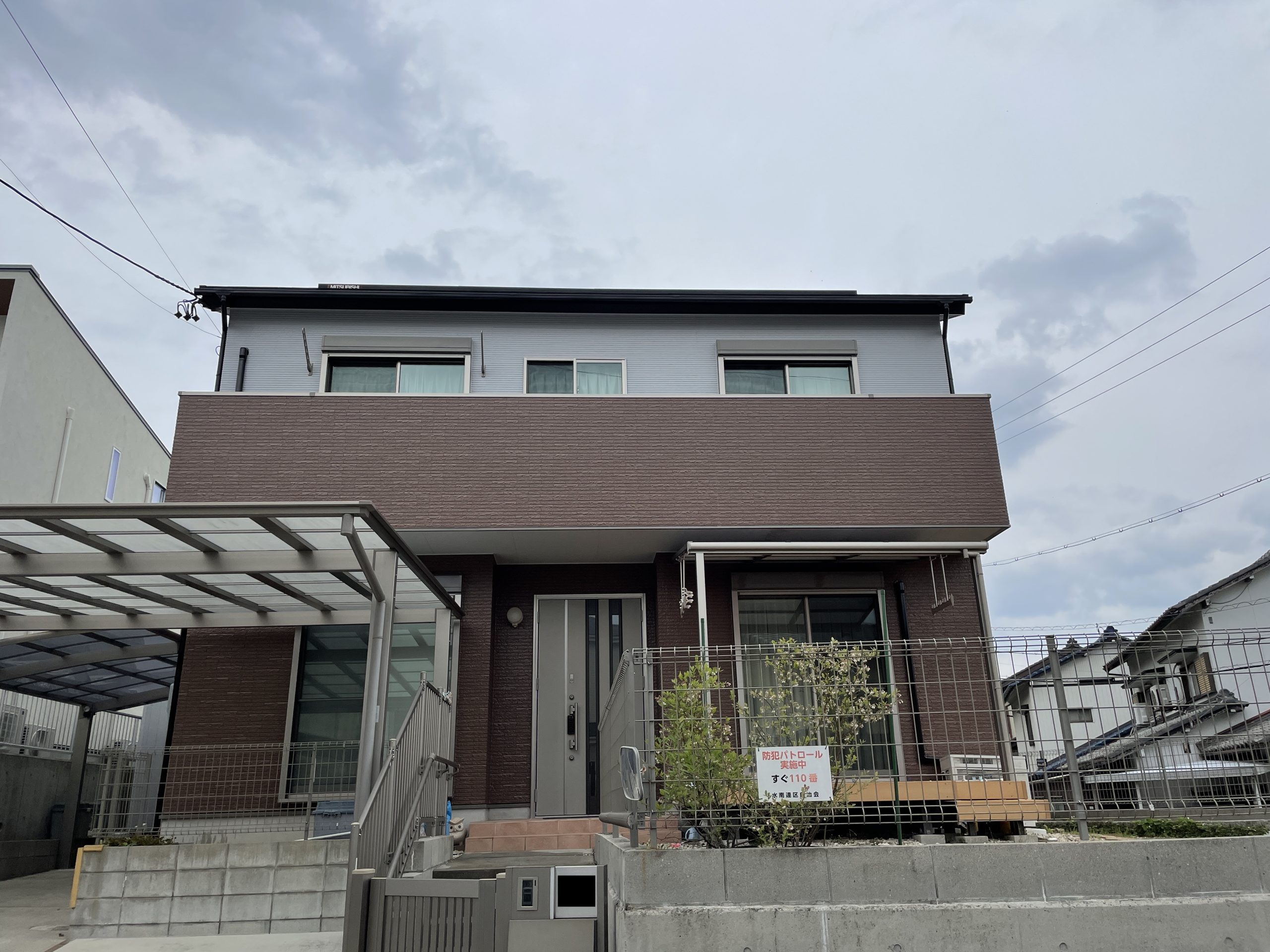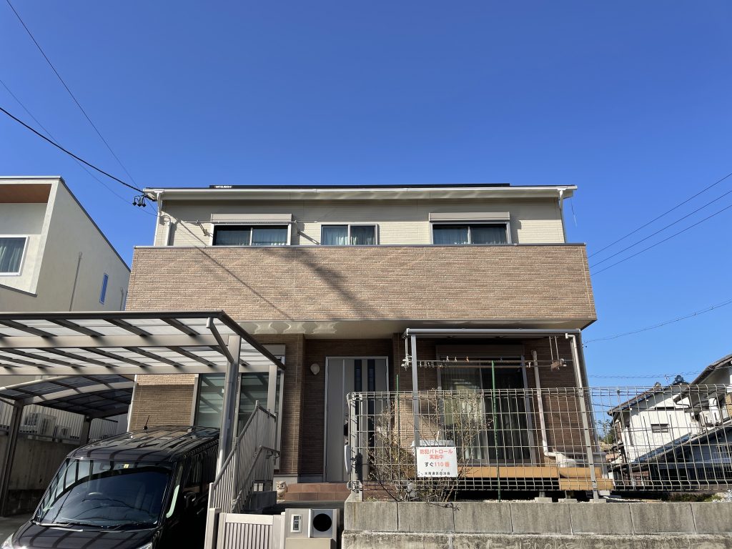 また、外壁の所々にヘアークラックが見られていた為、下地調整の際にサフェーサーという塗料を使用し仕上細かいひび割れが消えるように心掛けて塗装しました。築年数も浅く劣化がそこまで進行していなったことから外壁や屋根の塗装は問題なく進めることができ、とてもキレイに仕上がりました。
