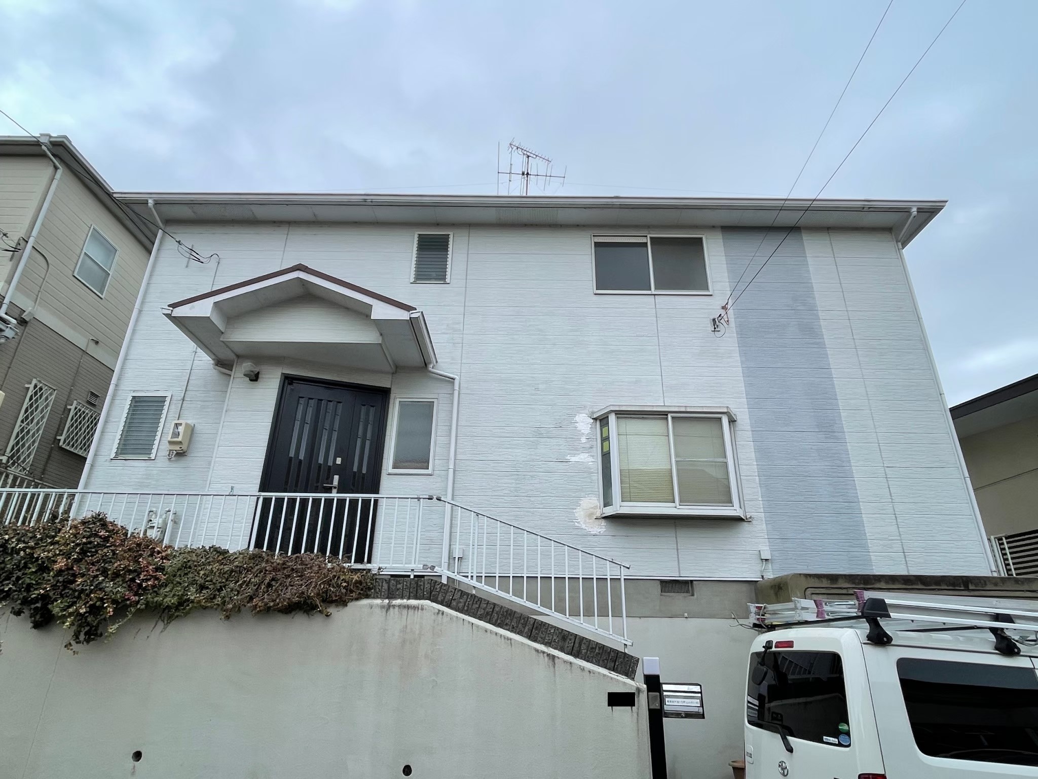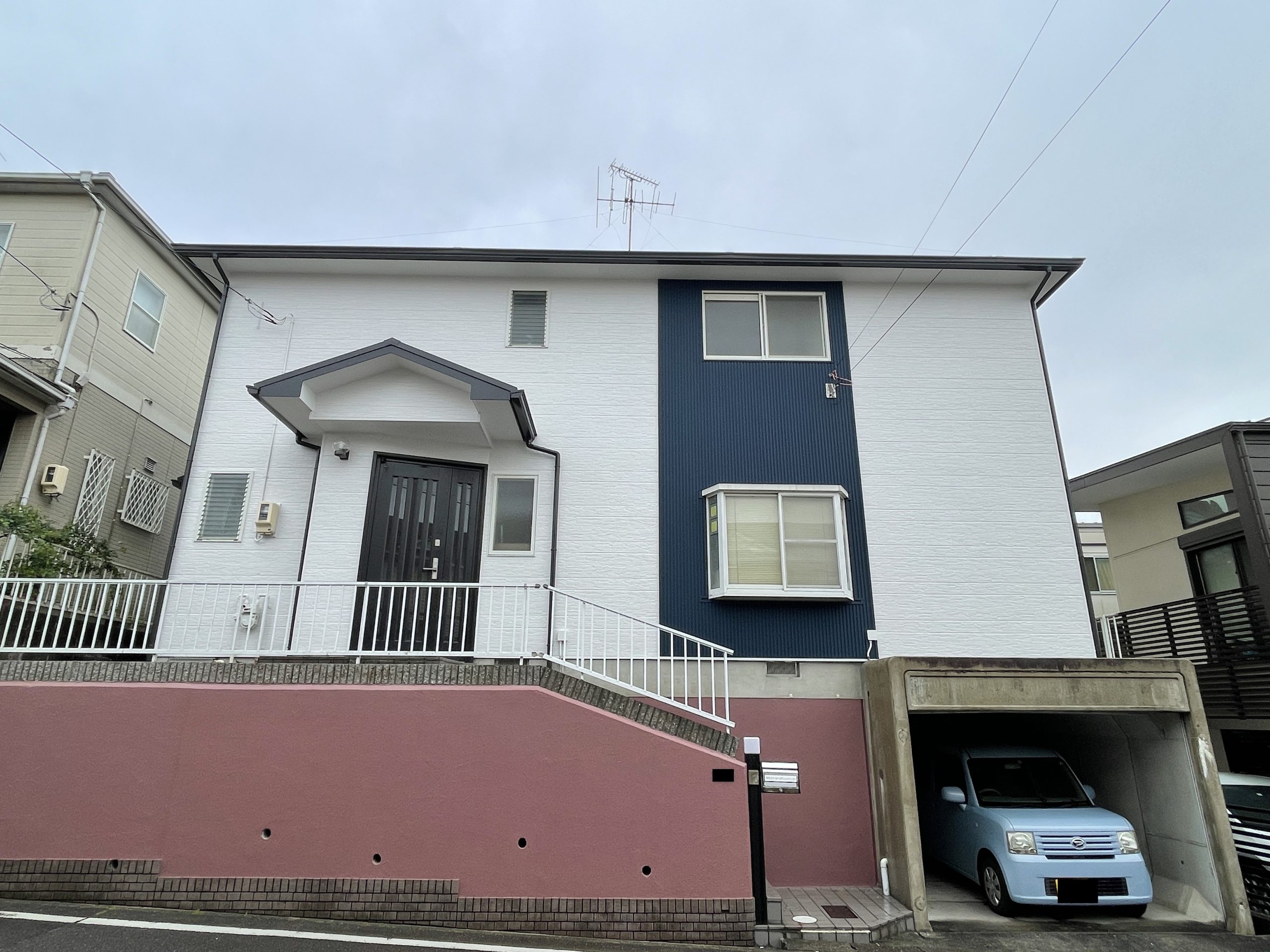 本来は全体の外壁を張り替えるか下地を組んで上から外壁を張るカバー工法が好ましかったのですが、施主様の予算の都合もあり部分的にカバー工法を採用しその他の部分は下地にエポキシ系の浸透系シーラーをたっぷり外壁に浸透させて、下地の外壁をがっちり固めてから上塗り塗装を行いました。また北側玄関のお家で正面の玄関面に1階から2階までネイビーカラー板金縦にアクセントとして取り付けを行いました。