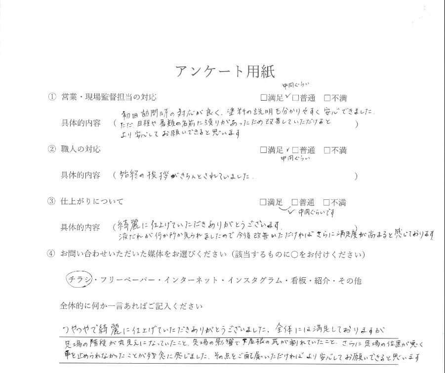つやつやで綺麗に仕上げていただきありがとうございました。全体には満足しておりますが、足場の階段が丸見えになっていたこと、足場の影響で下屋根の瓦が割れていたこと、さらに足場の位置が悪く車を止められなかったことが残念に感じました。その点を配慮していただければより安心してお願いできると思います。